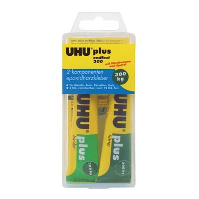 UHU plus 300 to bezrozpuszczalnikowy dwuskładnikowy klej na bazie żywicy epoksydowej, o wysokiej wytrzymałości wiązania kleju przy łączeniu różnorodnych materiałów.